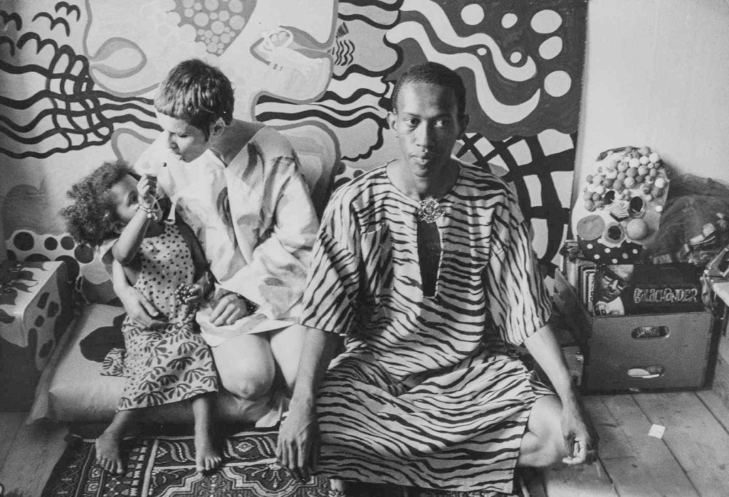 Don Cherry med Neneh och Moki i lägenheten i Gamla Stan, Stockholm, 1967.